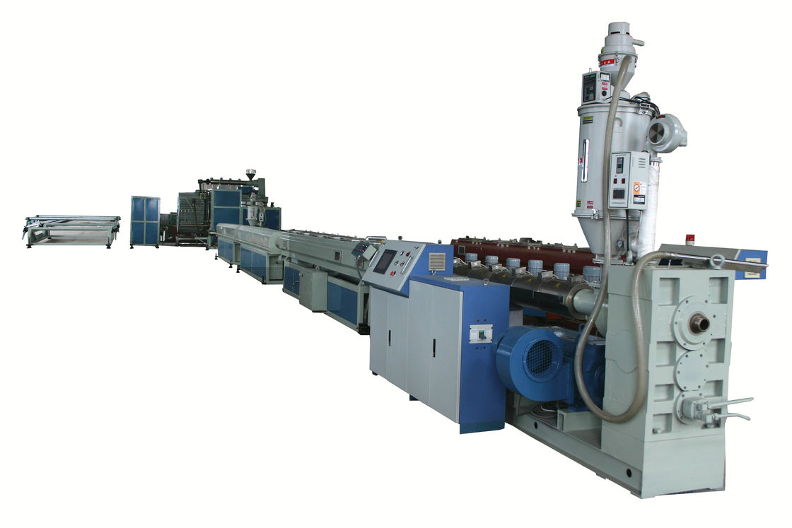 این خط اکستروژن لوله شامل اکسترودر، قالب، قالب، ماشین شکل دادن مارپیچ، قالب سازی، اکسترودر چسب، سیستم کالیبراسیون خلاء، مخزن اسپری آب، دستگاه برش، براکت واژگون و کل سیستم کنترل خط است.